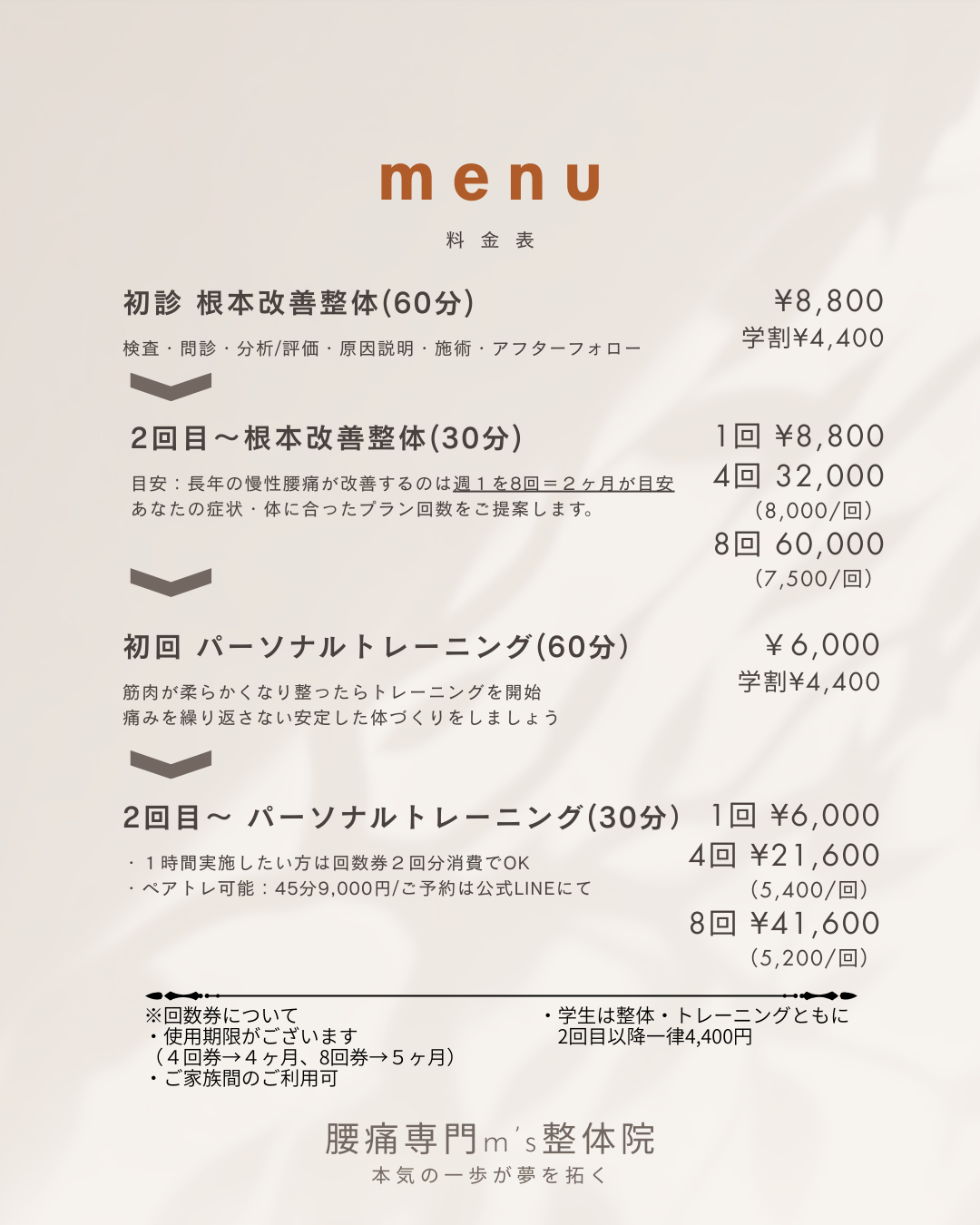 | 【初めて・一般】根本改善整体 | 60分 | 8,800円(税込) | ①ヒアリング ②分析・評価 ③原因説明 ④根本改善施術 ⑤アフターフォロー | |